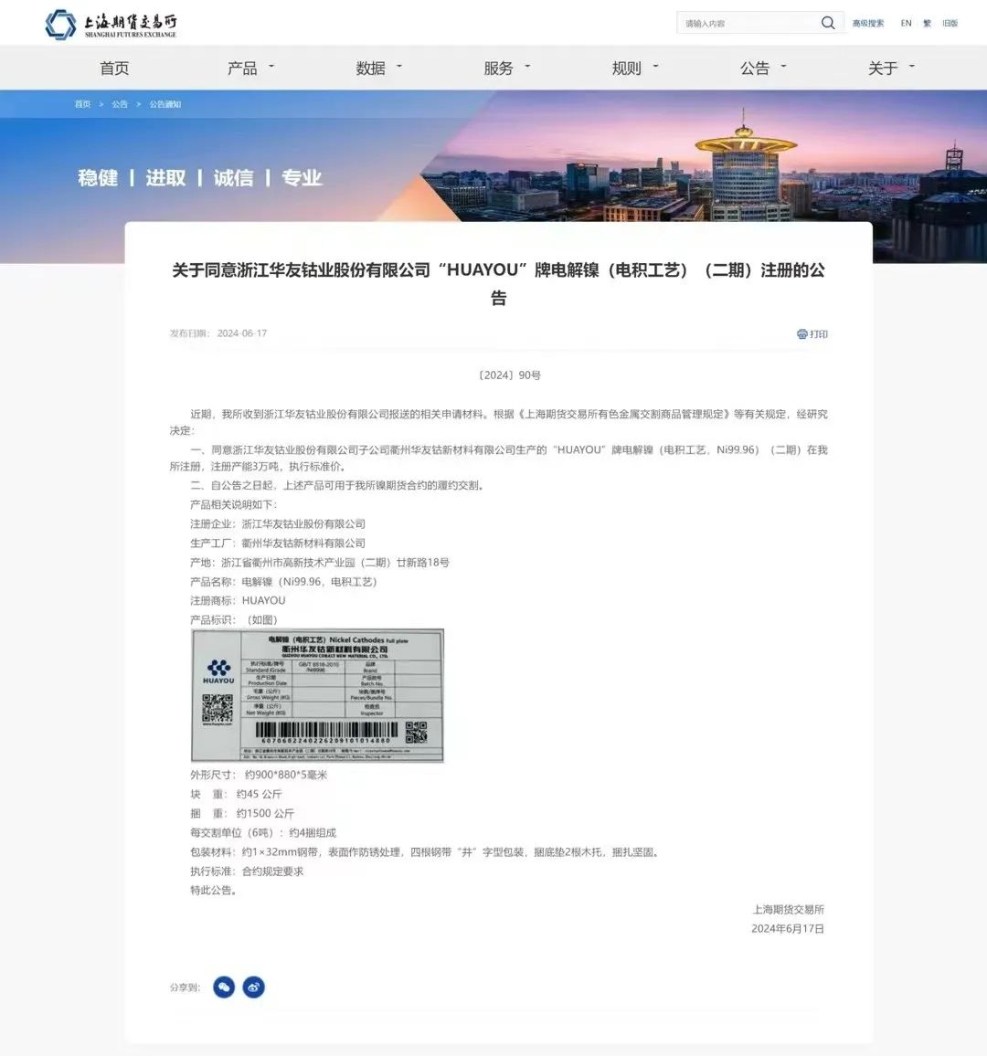 “HUAYOU”牌電解鎳(二期)自2024年1月份起,公司與上海期貨交易所積極溝通,經(jīng)過嚴格的實地考察和抽樣檢驗,最終上海期貨交易所認定華友鈷業(yè)生產(chǎn)的“HUAYOU”牌電解鎳(二期)符合交割品牌的各項要求,允許成為交割品牌,自此印有“HUAYOU”標識的電解鎳將再次走進客戶心中。
