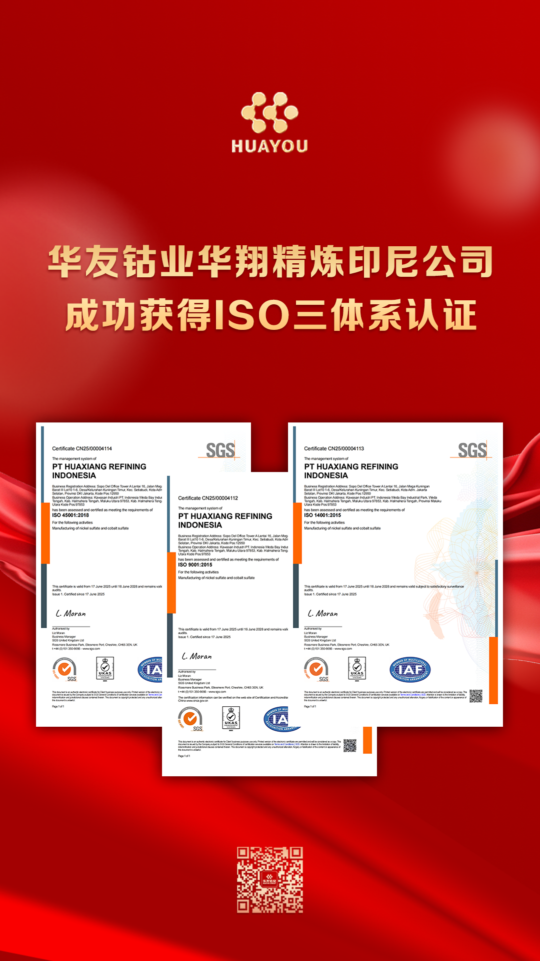 6月17日,華友鈷業(yè)旗下子公司華翔精煉印尼有限公司正式獲得SGS頒發(fā)的ISO 9001 質(zhì)量管理體系、ISO 14001 環(huán)境管理體系及ISO 45001 職業(yè)健康安全管理體系認(rèn)證證書(shū),標(biāo)志著子公司在規(guī)范化、標(biāo)準(zhǔn)化和可持續(xù)發(fā)展方面邁出堅(jiān)實(shí)一步。